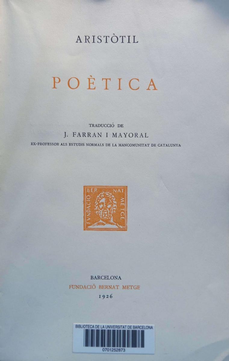 Un altre personatge que Estelrich sabé lligar a la FBM fou Josep Farran i Mayoral (1885-1955), que era professor als Estudis Normals (entengui’s l’Escola Industrial) de la Mancomunitat i que ja havia traduït un clàssic grec al català, en concret, el Diàlegs dels déus i de les divinitats marines de Llucià de Samòsata l’any 1919. Farran i Mayoral traduí per a la FBM la Poètica i la Constitució d’Atenes d’Aristòtil l’any 1926 (Nr. 89). D’aquesta manera, s’actualitzava un text de poètica essencial que ja havia traduït al català el pare Ignasi Casanovas el 1907 (*).
