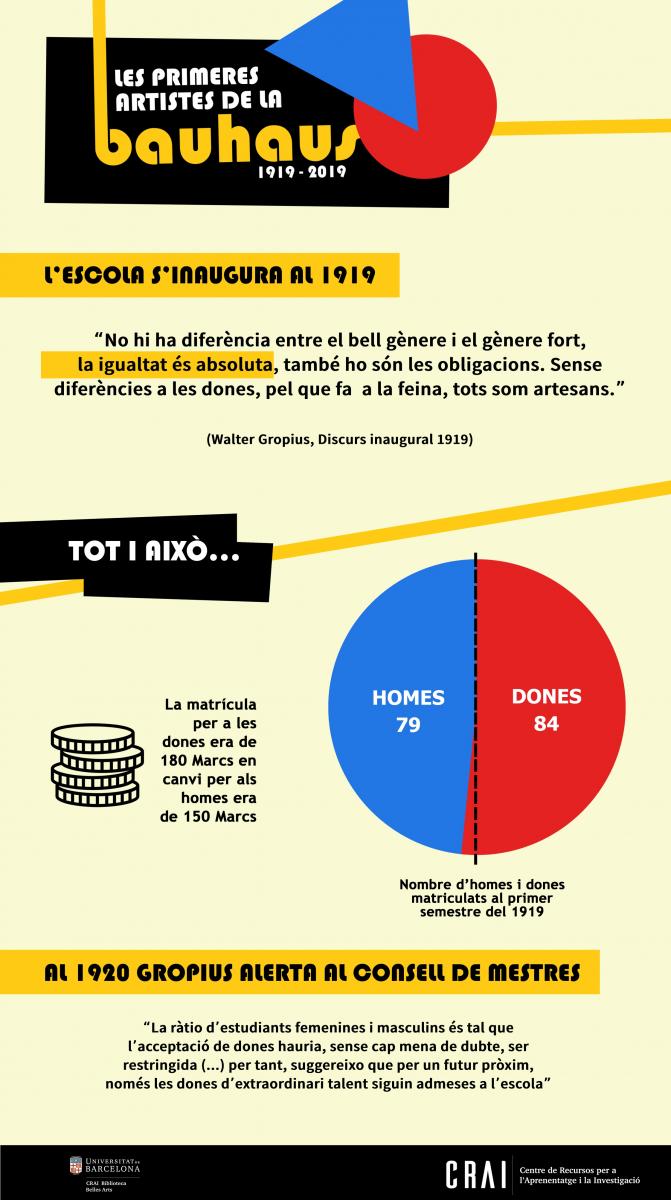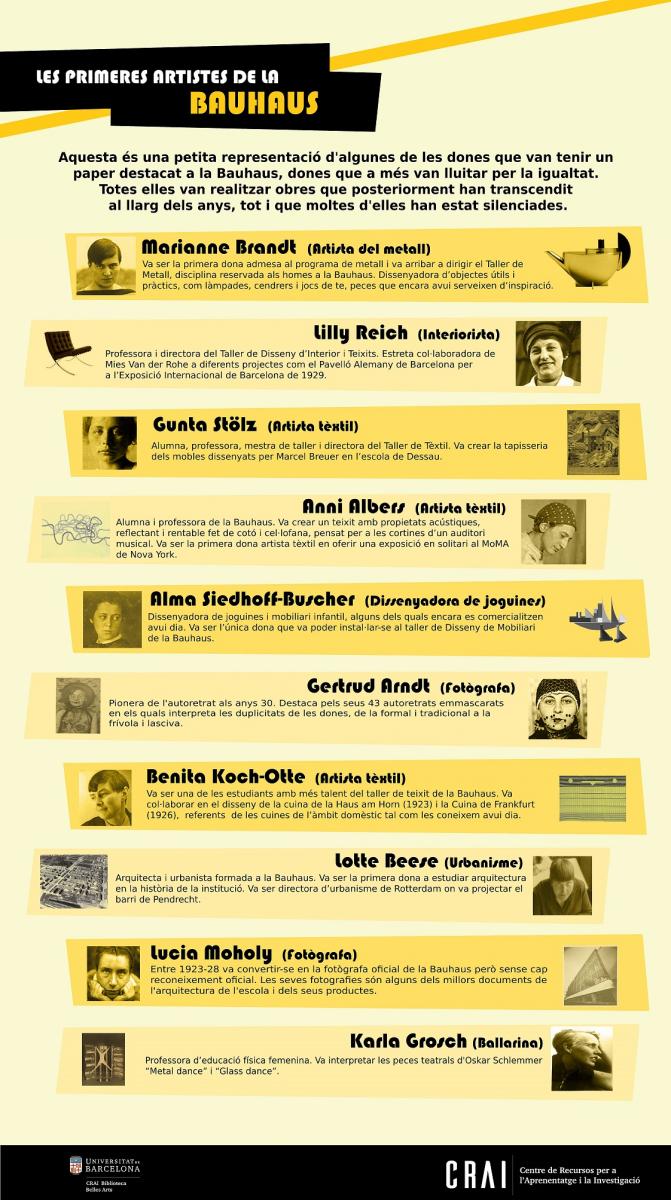 Aquest 2019 es commemora el centenari de la creació de la primera escola integral de disseny del segle XX, la Bauhaus. Walter Gropius, Ludwig Mies van der Rohe, Paul Klee, Vasili Kandinski són alguns dels noms que sempre apareixen quan es menciona l'escola, tots masculins, però què passa amb les dones?