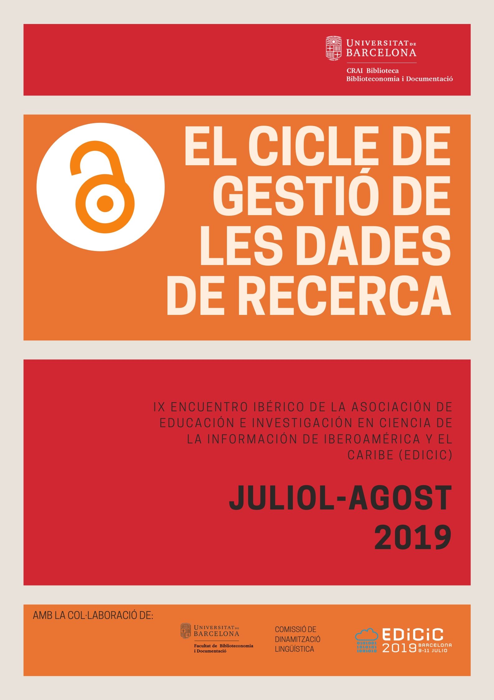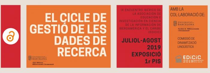 Amb motiu del “IX Encuentro Ibérico de la Asociación de Educación e Investigación en Ciencia de la Información de Iberoamérica y el Caribe (EDICIC)” celebrat del 9 a l'11 de juliol de 2019, a la Facultat de Biblioteconomia i Documentació, des del CRAI Biblioteca de Biblioteconomia i Documentació hem organitzat l'exposició "El cicle de gestió de les dades de recerca" que podeu visitar al 1r pis.