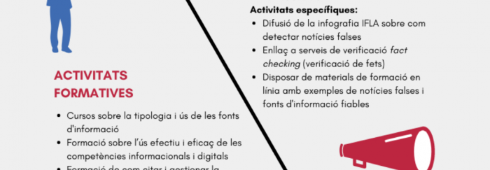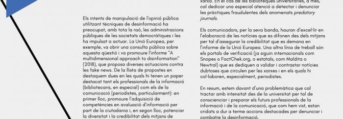 · Com combatre les notícies falses: el paper dels bibliotecaris és clau per combatre la desinformació. Amb les sessions que es fan de formació des de les biblioteques, s’ha d’aconseguir que els usuaris siguin crítics en l’ús de la informació.