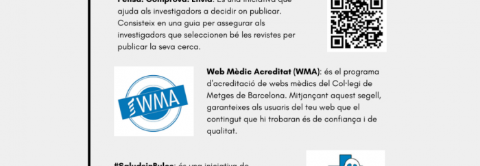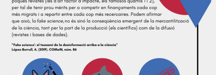 · Com combatre les notícies falses sobre ciència: representa un problema en un entorn competitiu i amb una necessitat de publicar ràpidament, sovint i en revistes amb un alt factor d’impacte. Dins de la fack science trobem tres apartats: pseudociència, revistes depredadores i articles retirats.