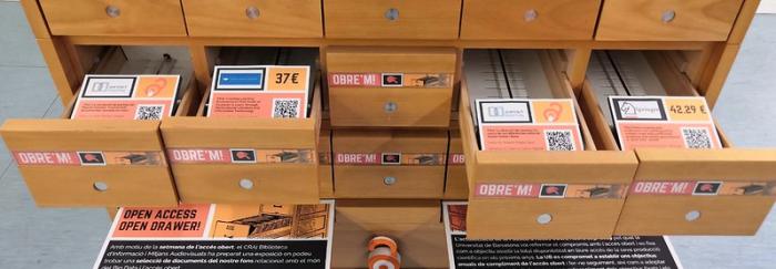 L'exposició interactiva consisteix a obrir calaixos de l’antic catàleg de fitxes on podeu trobar referències d’articles científics tancats i oberts de diversos repositoris i editorials.