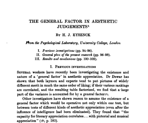 Mogut per les indicacions del seu mentor —Cyril Burt— i la passió per l’art, Eysenck enfoca els seus primers treballs d'investigació a l’estudi de l’existència de diferències individuals en l’emissió de judicis sobre l’estètica.