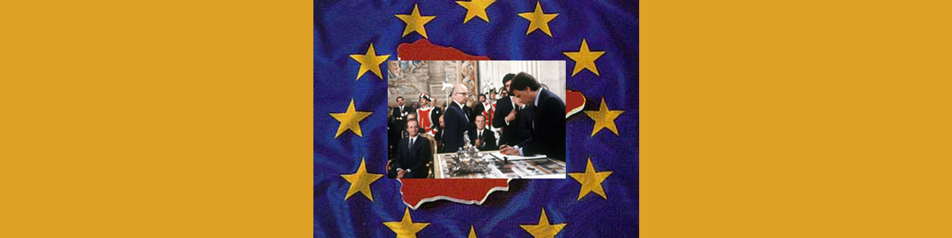 | España es Europa (1986) (La imagen de tu vida - RTVE- 09-12/2006 - 00'58'') El 12 de juny de 1985 es va signar el tractat d'adhesió, l'1 de gener de 1986 Espanya i Portugal s'incorporaven oficialment a la Unió Europea. |