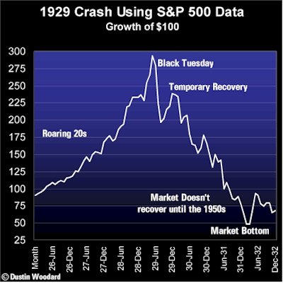 per comprar accions amb la garantia de les que ja es tenien. Però aquesta expectativa no es corresponia a un creixement real de l'economia ni als beneficis que les empreses obtenien. La borsa tocà fons el 1932 amb una pèrdua del 90% de l'ndex Dow Jones, que no es va recuperar als nivells previs a la davallada fins el 1954.