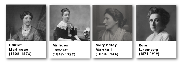 Escriptora i activista social (feminista, abolicionista, economista, sociòloga, filòsofa) anglesa. El seu treball es va centrar en la tributació i la política econòmica. Harriet Martineau propugna teories econòmiques polítiques a Illustrations of Political Economy. També va escriure La sociedad en América. Anomenada una de les “Filles de Smith”, ja que va adaptar el seu treball a una audiència posterior, ha passat a la història per desenvolupar l’origen dels processos de producció i la divisió del treball, i també per combinar literatura i economia, aconseguint textos comprensibles per a la majoria de població. Va ser, a més, una feminista activa: Martineau col·loca les dones més centralment dins la pràctica i la teoria econòmica. En aquest context, les dones no només representen una part en l'economia a gran escala, sinó que també (a causa de la seva participació) se'ls anima a aprendre els principis de l'economia política. D'entre les seves obres podem esmentar: