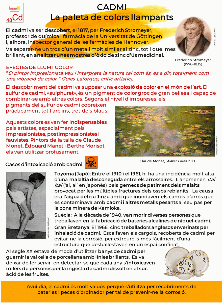 El descobriment del cadmi va suposar una explosió de color en el món de l’art. El sulfur de cadmi, «sulphuret», és un pigment de color groc de gran bellesa i capaç de combinar-se amb altres colors. Segons el nivell d’impureses, els