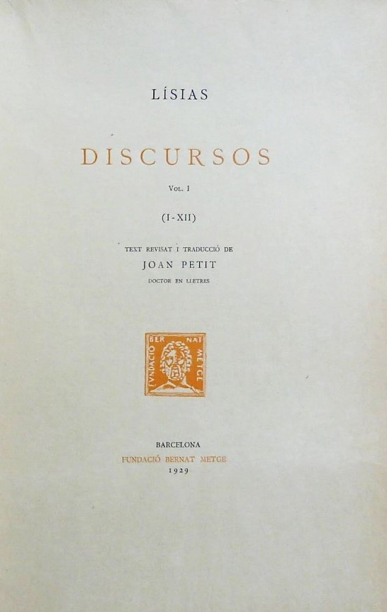 (86) Lísias, Discursos. Vol. I (I-XII). Text revisat i traducció de Joan Petit ..., Barcelona, FBM, 1929.