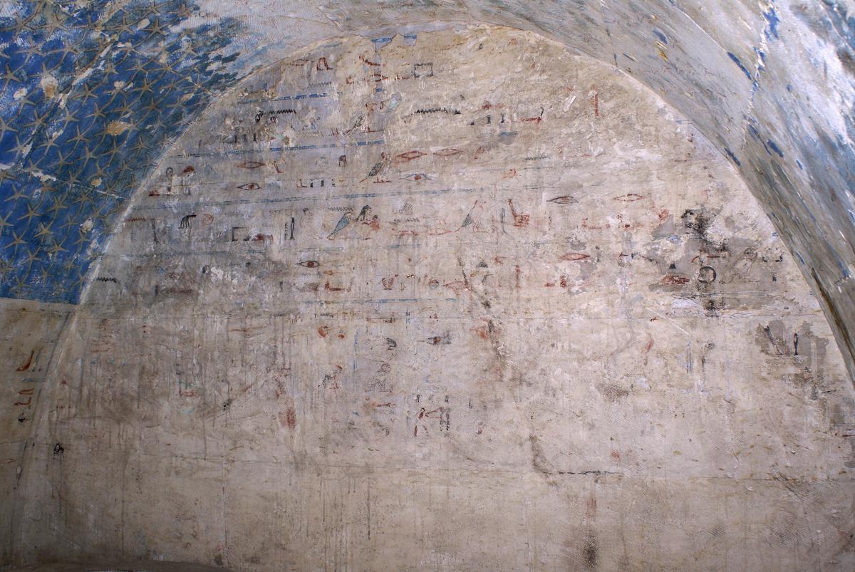 Imatge de la sala 2 de la tomba saïta 1. S’aprecia el sostre de volta de canó i, a la llinda de la porta, una inscripció en escriptura jeroglífica cursiva i en escriptura demòtica feta amb tinta vermella.