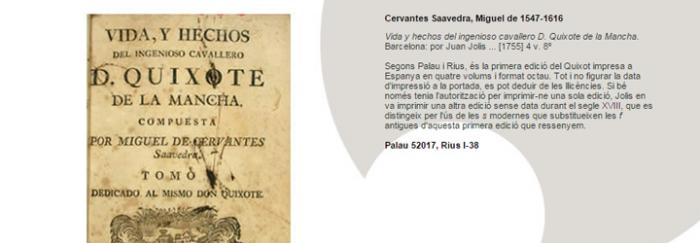 Exposició virtual que es va publicar al web del CRAI l'any 2005 per commemorar el quart centenari de la primera edició de 'El Ingenioso hidalgo don Quijote de la Mancha', afegint-se així a les ja nombroses iniciatives desenvolupades per diverses institucions i organismes.
