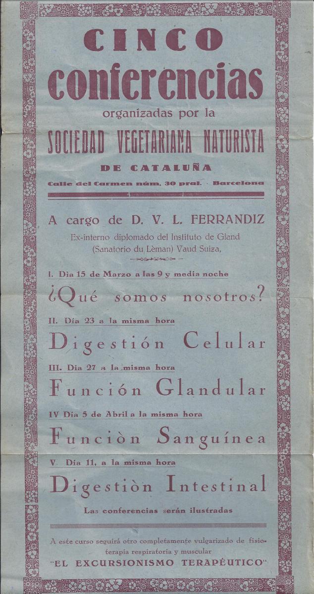 El 1951 va constituir la Penya Vegetariana de Barcelona i la Federació Vegetariana Espanyola. Un any després, el 6 de novembre de 1952, coincidint amb la celebració del Congrés Eucarístic a Barcelona, i a causa d’una denúncia a la policia feta per un professor naturista i metge partidari del règim franquista que el va acusar d’exercir la medicina sense titulació, es va haver d’exiliar a Perpinyà fins al 1967, any en què va tornar a Barcelona i va poder participar, el 1968, en el I Congreso Nacional Vegetariano. Va reeditar part de la seva obra i va publicar revistes com Trofoterapia i Regenérate.