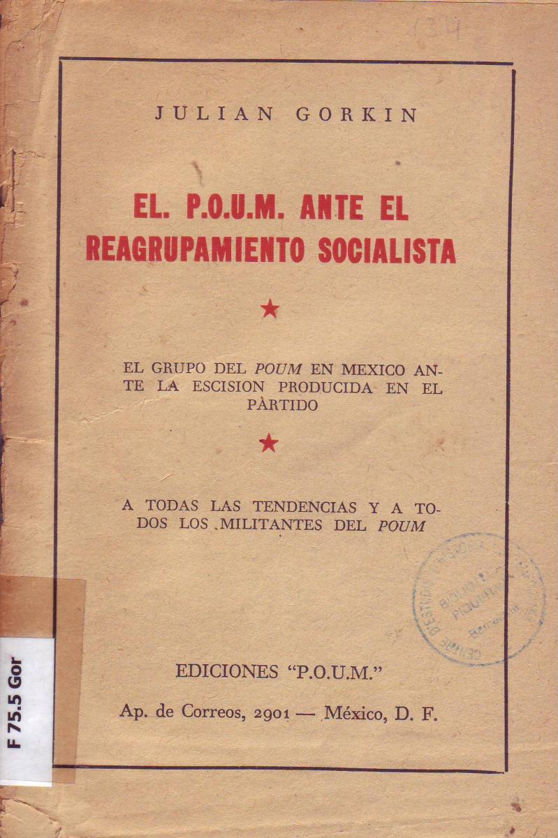 - GORKIN, Julián. El POUM ante el reagrupamiento socialista : el grupo del POUM en México ante la escisión producida en el partido, a todas las tendencias y a todos los militantes del POUM. Mèxic, 1946. [F 75.5 Gor]