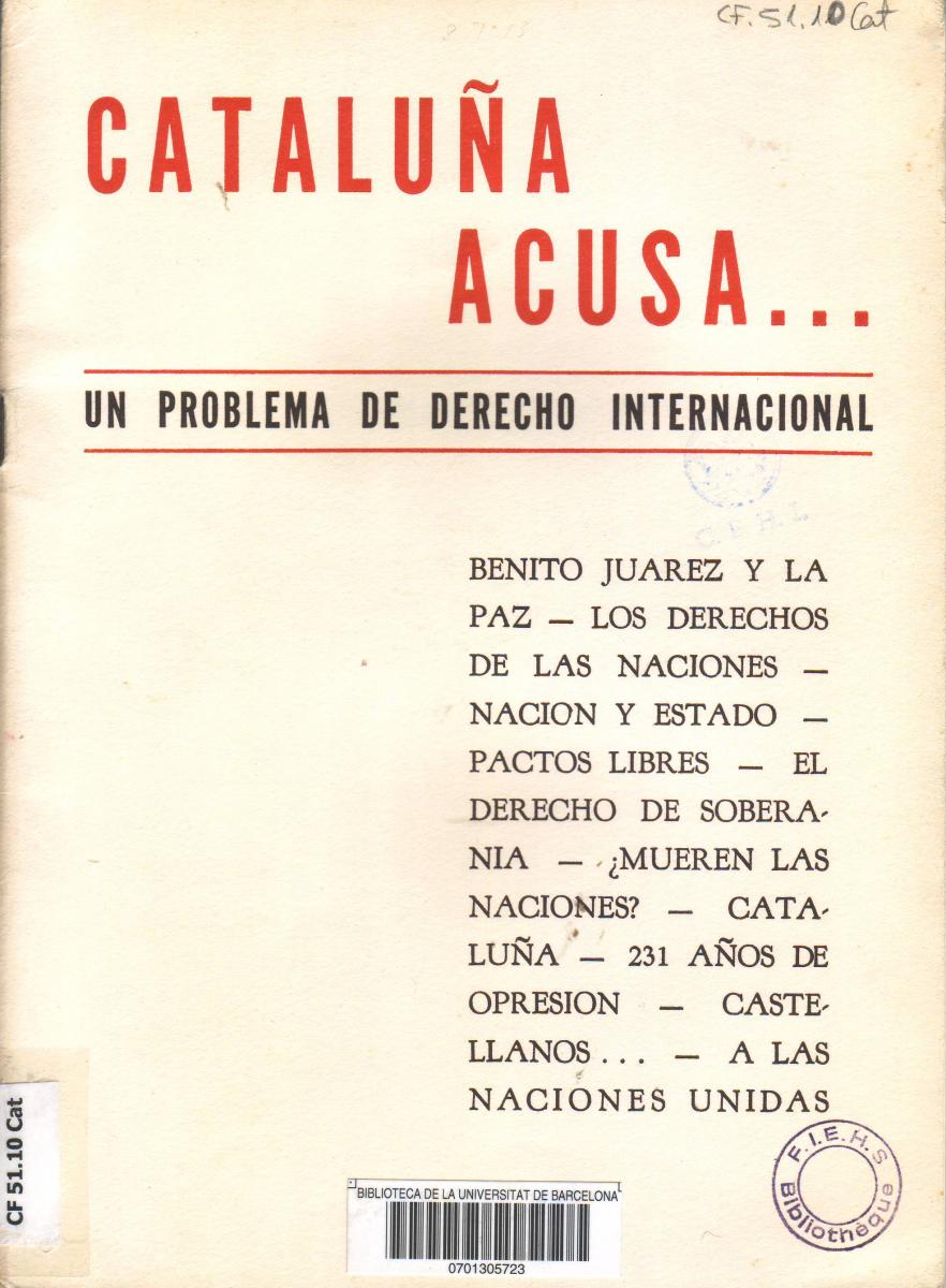 - Cataluña acusa. Un problema de derecho internacional. Mèxic, 1946. [CF 51.10 Cat]