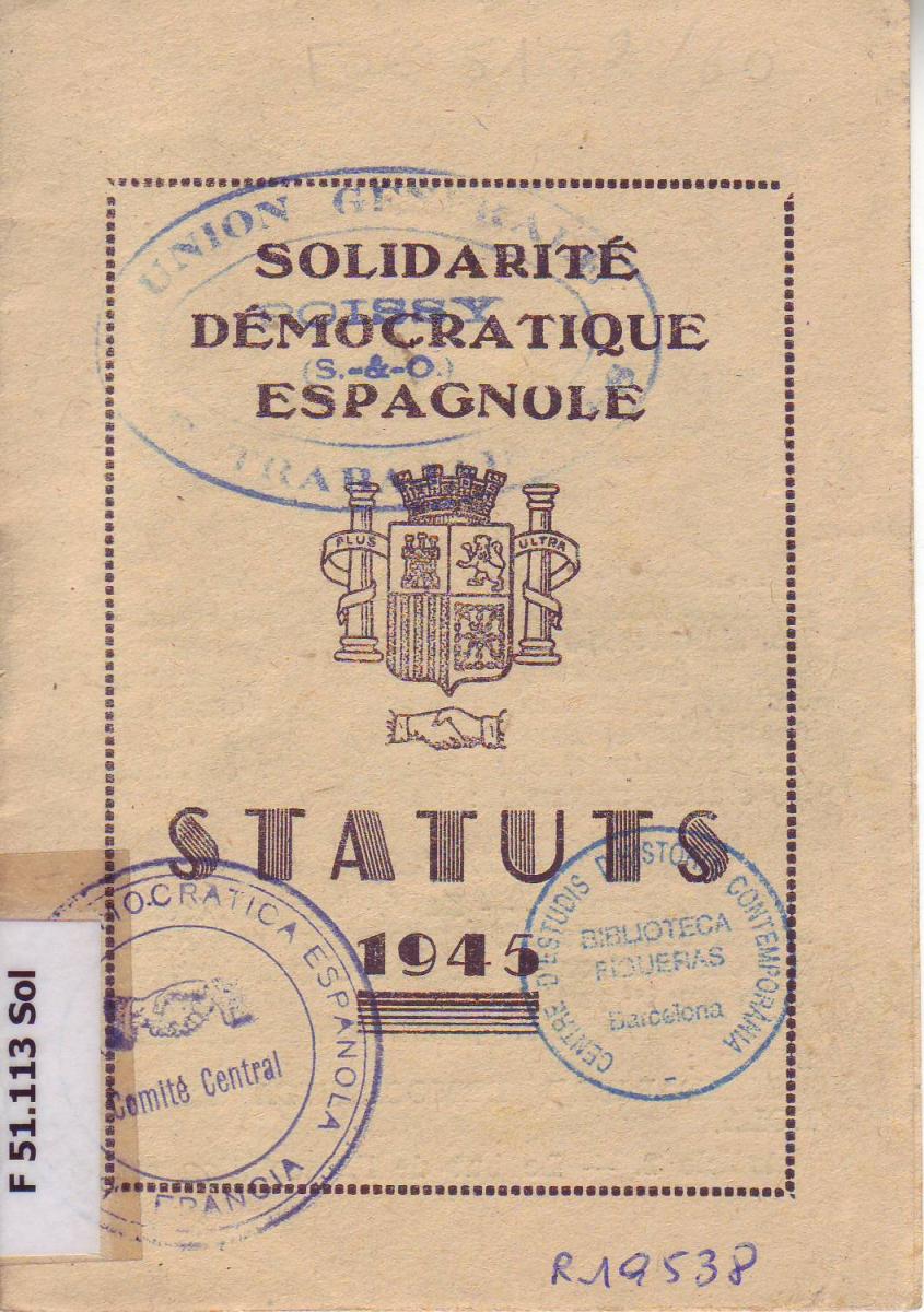 - SOLIDARIDAD DEMOCRATICA ESPAÑOLA. Statuts. Toulouse, 1945. [F 51.113 Sol]