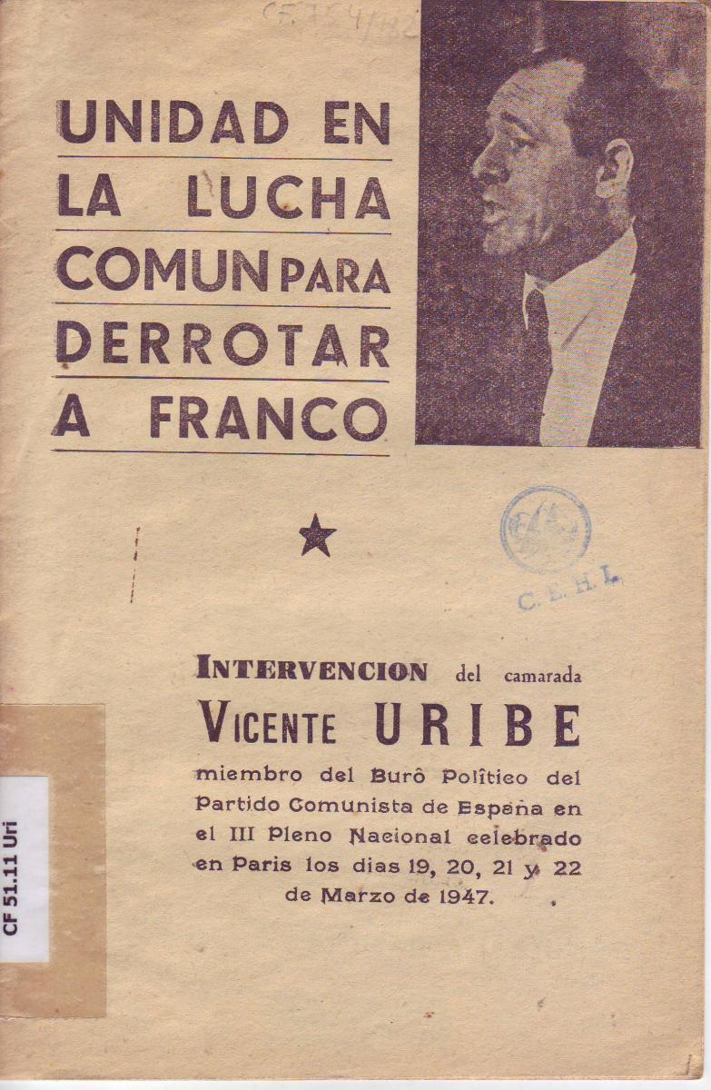 - URIBE, Vicente. Unidad en la lucha común para derrotar a Franco. Intervención del camarada … miembro del Buró Político del Partido Comunista de España en el III Pleno Nacional celebrado en París los dias 19, 20, 21 y 22 de marzo de 1947). [S.l.], [1947]. [CF 51.11 Uri]