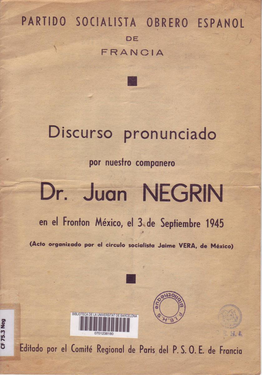 - NEGRIN LOPEZ, Juan. Discurso pronunciado por … el dia 3 de setiembre de 1945 en el Frontón México, ciudad de Méjico. Londres, 1945. [CF 75.3 Neg]