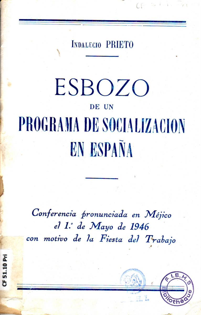 - PRIETO, Indalecio. Esbozo de un programa de socialización en España : conferencia pronunciada en Méjico e, 1º de mayo de 1946 con motivo de la fiesta del trabajo. Toulouse, [1946]. [CF 51.10 Pri]