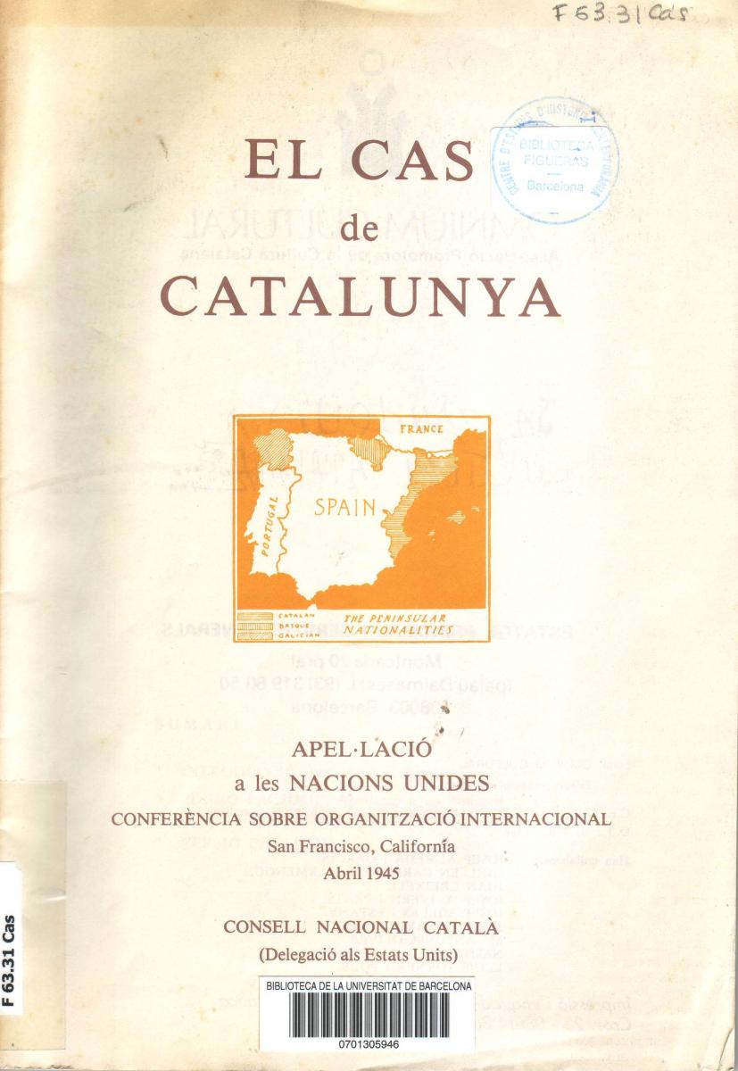 - CONSELL NACIONAL CATALA. The case of Catalonia. Appeal to the United Nations at the International Organisation Conference, San Francisco, California, April 1945. New York, 1945. [CF 63.31 Cas]