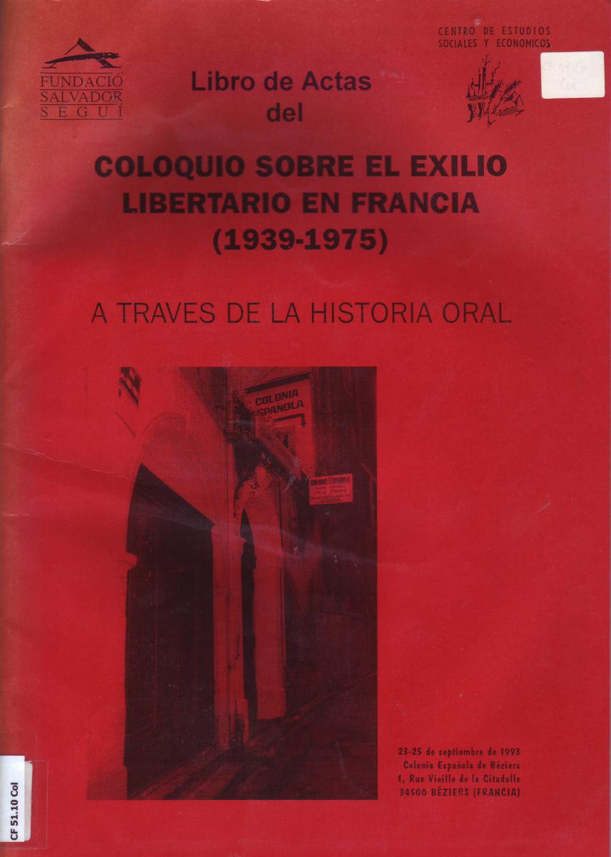 - COLOQUIO SOBRE EL EXILIO LIBERTARIO EN FRANCIA (1939-1975) A TRAVÉS DE LA HISTORIA ORAL (1993 setembre 23-25 : Béziers). València, 1996. [CF 51.10 Col]