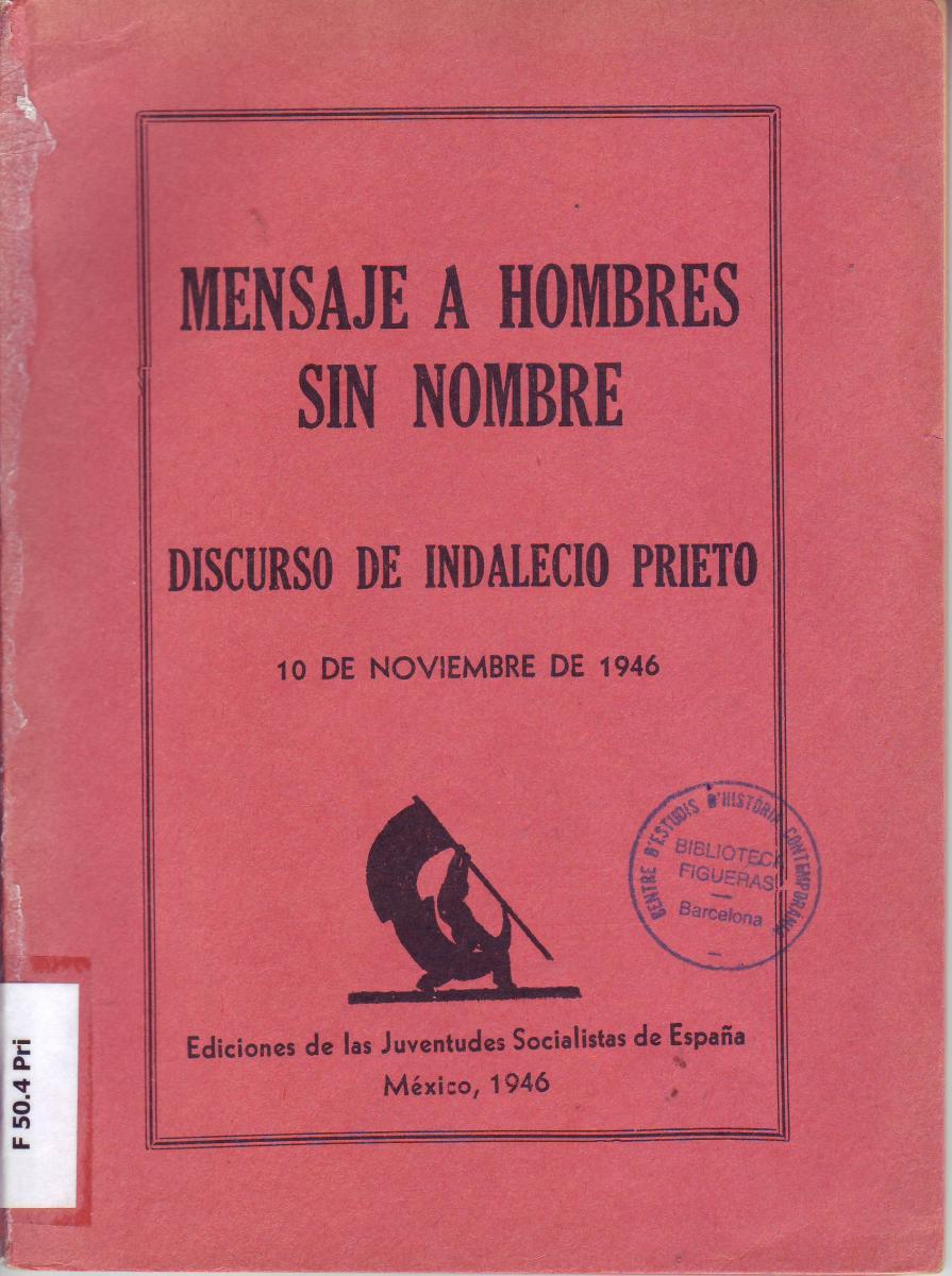 - PRIETO, Indalecio. Mensaje a hombres sin nombre. Discurso de … 10 de noviembre de 1946. Mèxic, 1946. [F 50.4 Pri]