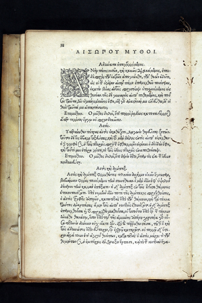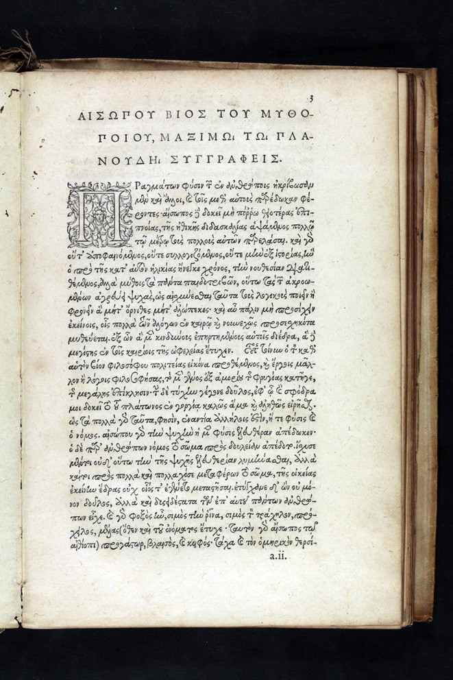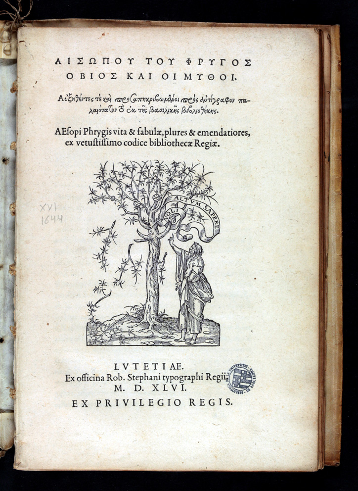 Títol: Αἰσώπου τοῦ Φρυγὸς ὁ βίος καὶ οἱ μῦθοι. Aesopi Phrygis uita & fabulae, plures et emendatiores, ex uetustissimo codice bibliothecae Regiae.