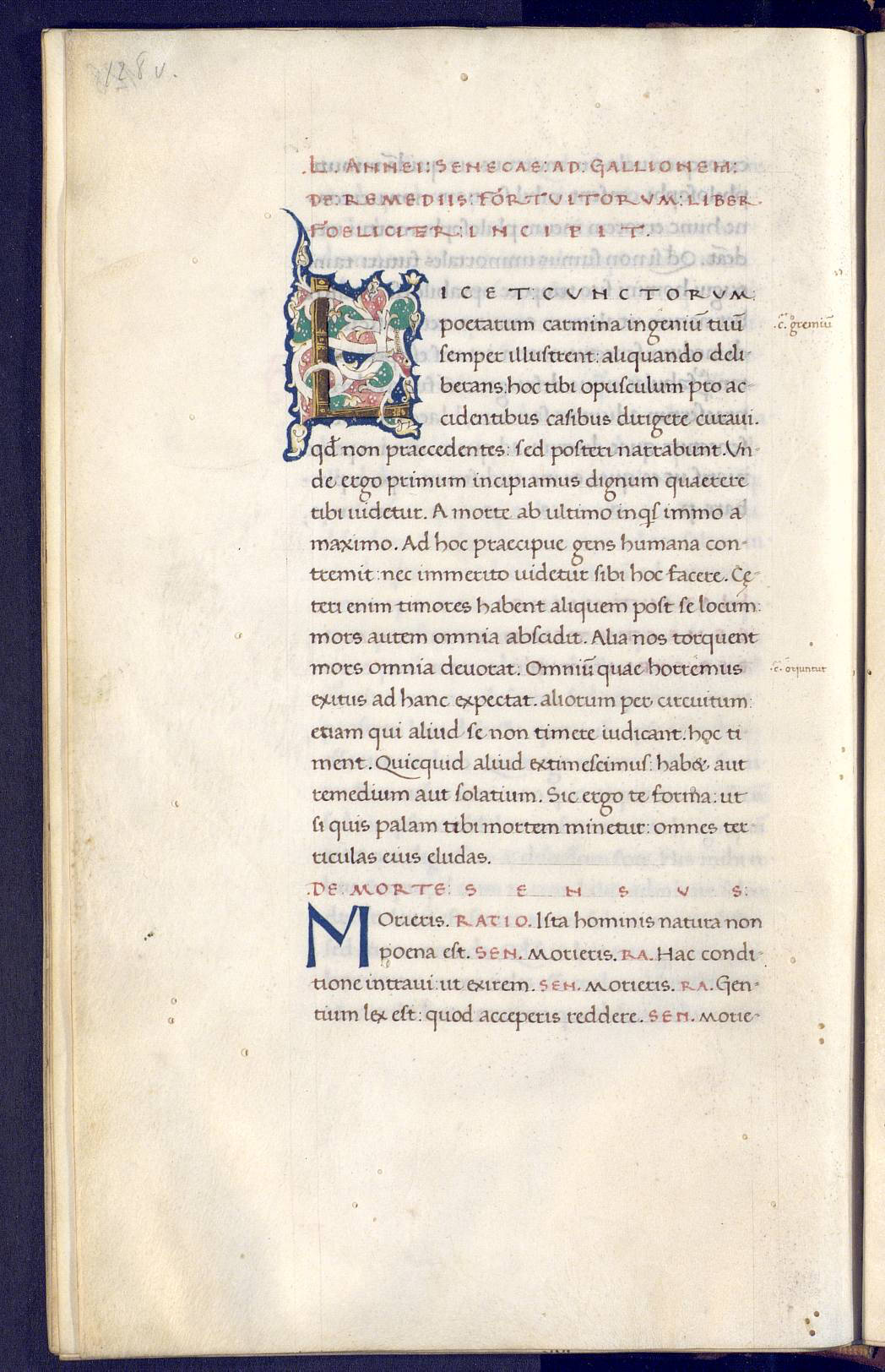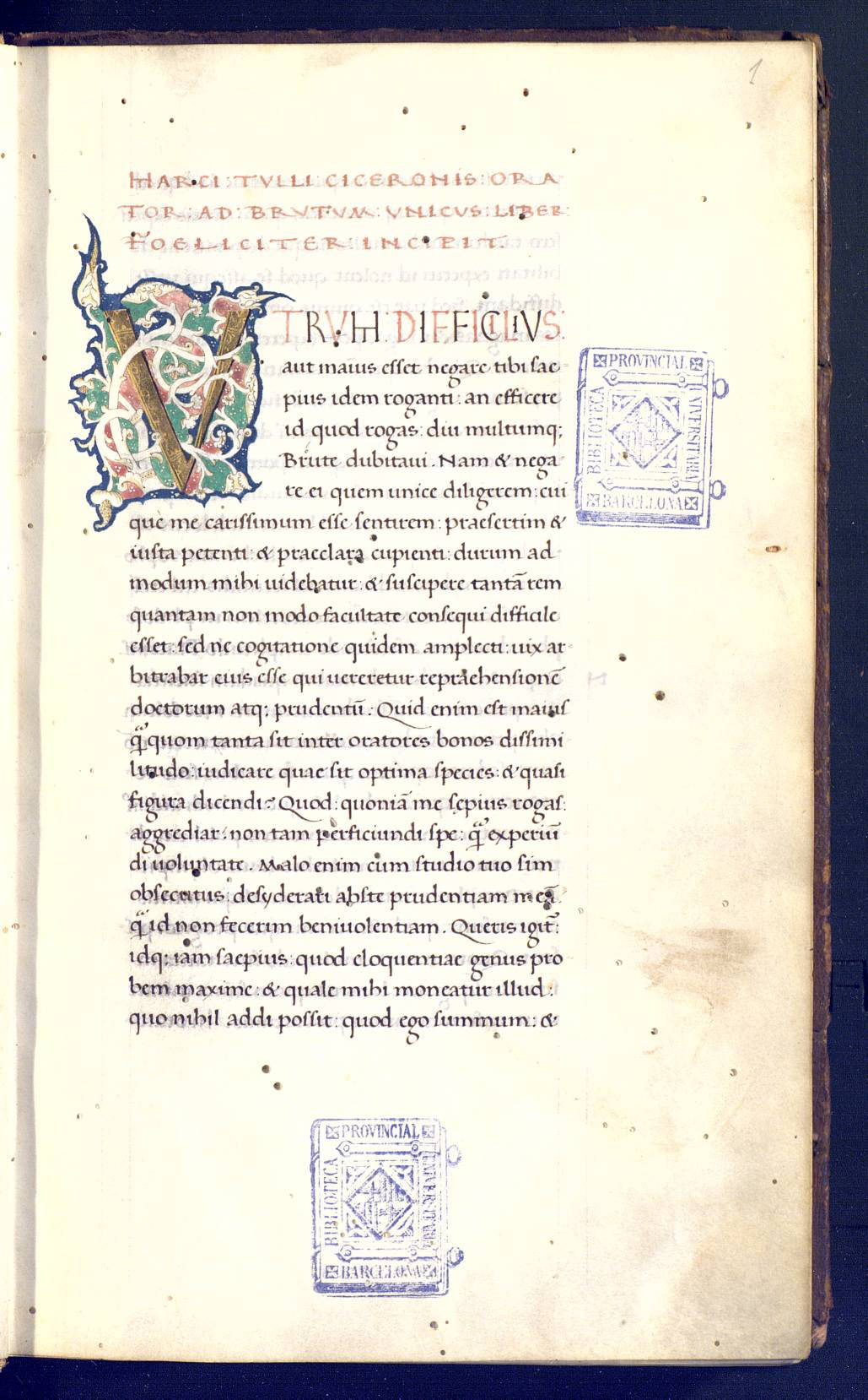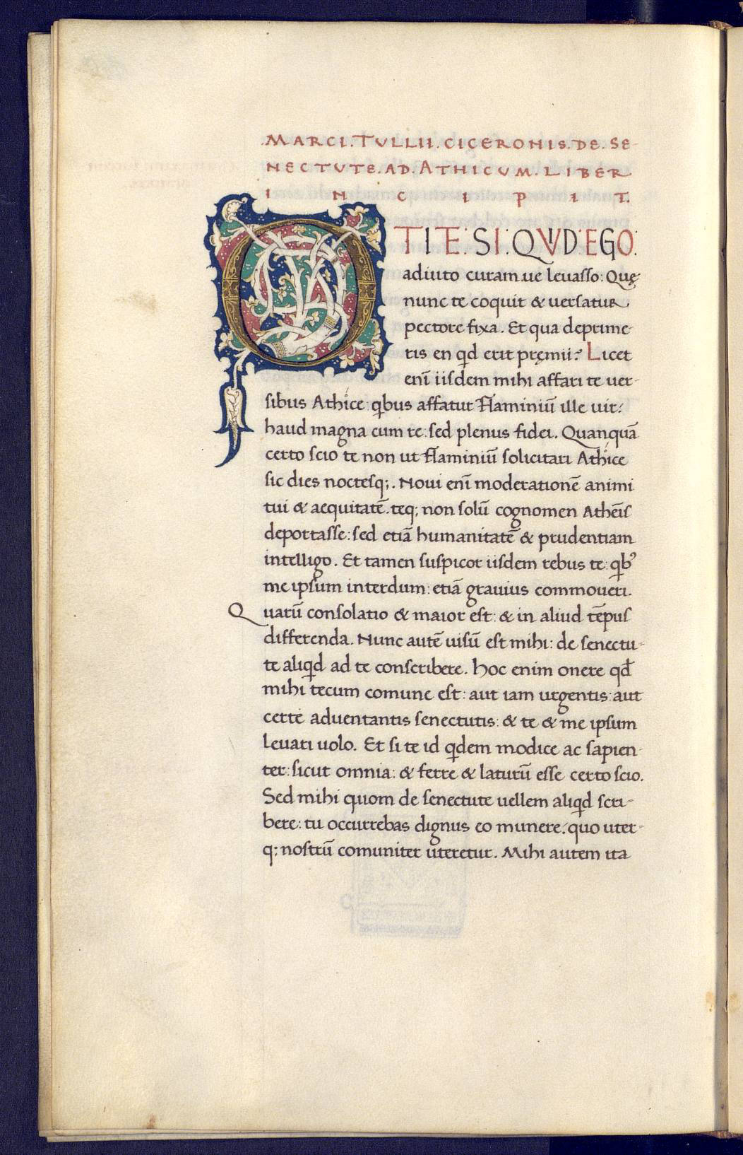 Contingut: M. T. Ciceronis orator ad Brutum, Brutus, de senectute ad Athicum. L. Annei Senecae de remediis fortuitorum ad Gallionem.