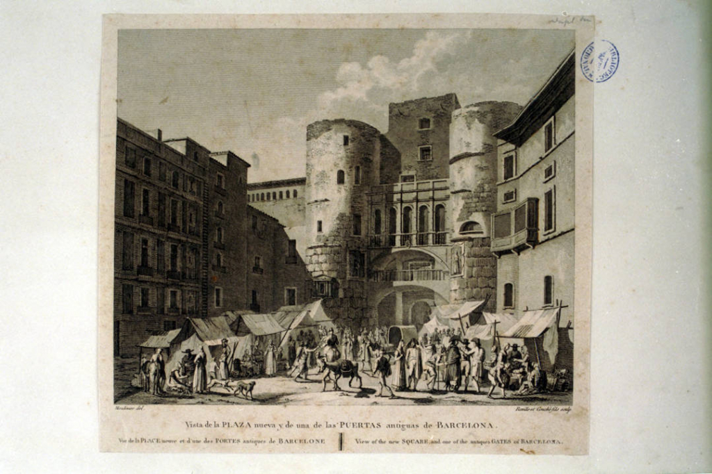 Vista de la Plaza nueva y de una de las puertas antiguas de Barcelona. Moulinier del. Reville et Couché fils sculp. Dins: Alexandre Laborde. Voyage pittoresque et historique de l'Espagne. París : de l'imprimerie de P. Didot l'ainé, 1806-1820.