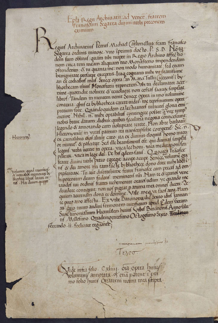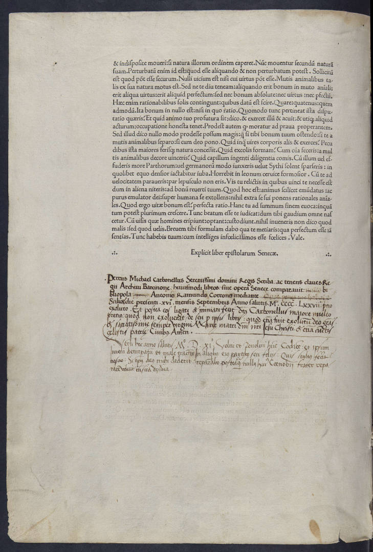 Al final del llibre trobem tres notes manuscrites de Pere Miquel Carbonell. A més d’indicar l’any en què va adquirir el llibre -1477- ens explica que ha pagat més diners per enquadernar-lo i il·luminar-lo que no pas en la seva compra. A continuació, una inscripció del 1511 fa referència a la gran decepció que ha tingut en veure l’estat de deixadesa en què es troba a la biblioteca del convent de Sant Francesc d’Assís de Barcelona, a qui en va fer donació l’any 1486, tal com ens ho indica la carta manuscrita adjunta al principi de l’obra.