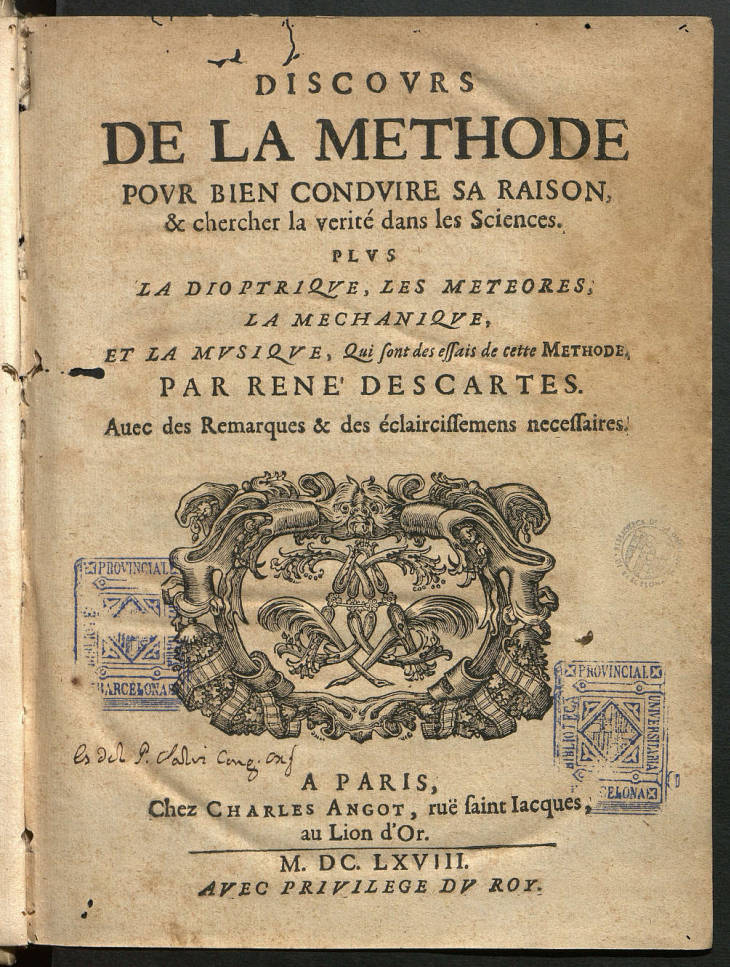 Tercera edició de l’obra fonamental de la filosofia moderna amb una gran repercussió per al desenvolupament posterior de la disciplina. S’hi presenta la famosa dita «Penso, per tant existeixo», que va obtenir un gran ressò.