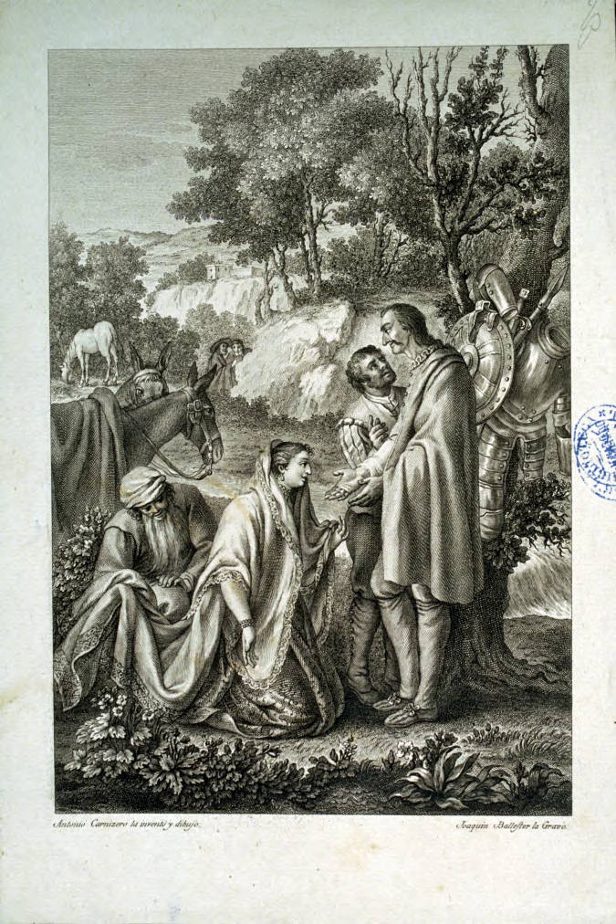 Ballester, Joaquim. [Don Quijote recibe la reverencia de una señora ante la presencia de Sancho y el criado de la dama] [Material gràfic] / Antonio Carnizero la inventò y dibujò ; Joaquin Ballester la gravò. [Madrid : Joaquín Ibarra, 1780].
