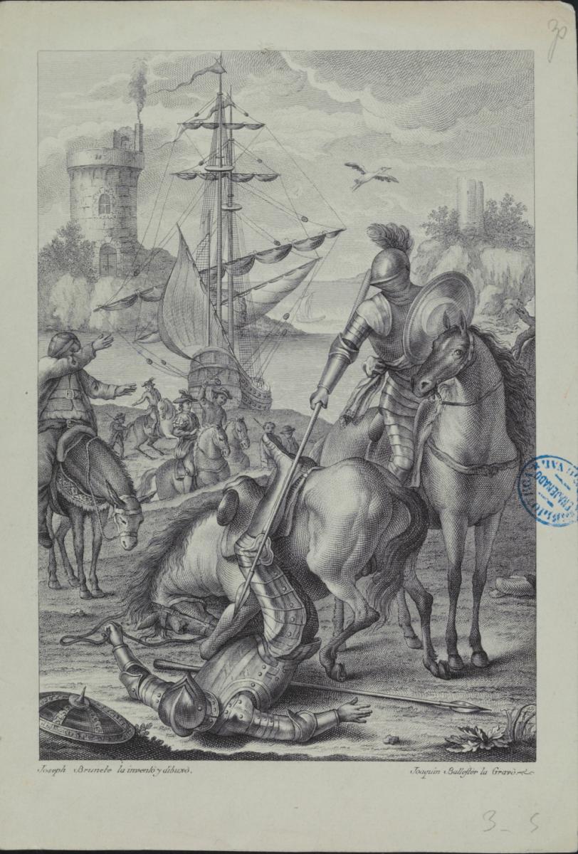 Ballester, Joaquim. [Lucha de Don Quijote y otro caballero-uno de ellos en el suelo- con la presencia de Sancho y con una nave y el mar al fondo] [Material gràfic] / Joseph Brunete la inventò y dibuxò ; Joaquin Ballester la gravò. [Madrid : Joaquín Ibarra, 1780].