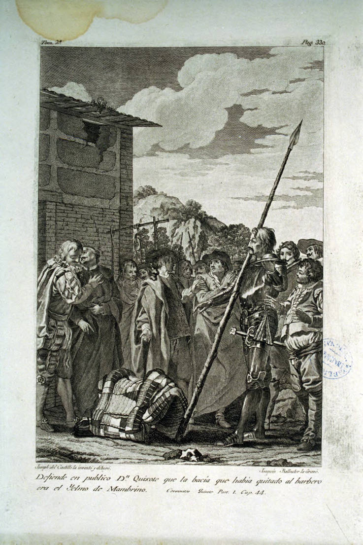 Ballester, Joaquim. Defiende en publico Dn Quixote que la bacia que habia quitado al barbero era el Yelmo de Mambrino [Material gràfic] / Joseph del Castillo la inventó y la dibujó ; Joaquin Ballester la gravó. [Madrid : Joaquín Ibarra, 1780].