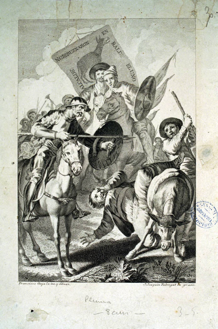 Fabregat, Josep Joaquim. [Lucha de Don Quijote montado a caballo con gente armada con palos; Sancho se cae del burro] [Material gràfic] / Francico Goya la inv. y dibuxò ; J.Joaquin Fabregat la gravò. [Madrid : Joaquín Ibarra, 1780].