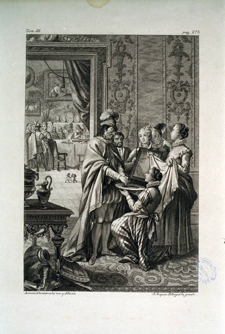 Fabregat, Josep Joaquim. [Unas doncellas sostienen una vasija y un trapo para que Don Quijote se lave las manos; mientras Don Quijote se mira a un espejo ante la mirada de Sancho] [Material gràfic] / Antonio Carnicèro la inv. y dibuxò ; J. Joaquin Fabregat la gravò. [Madrid : Joaquín Ibarra, 1780].