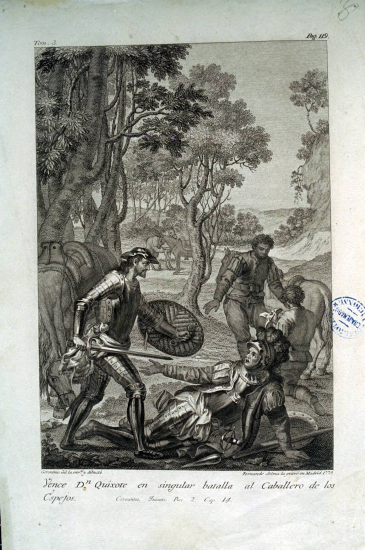 Selma, Ferran. Vence Dn Quíxote en singular batalla al Caballero de los Espejos [Material gràfic] / Geronímo Gil la inv.tó y dibuxò ; Fernando Selma la gravò en Madrid 1779. [Madrid : Joaquín Ibarra, 1780].