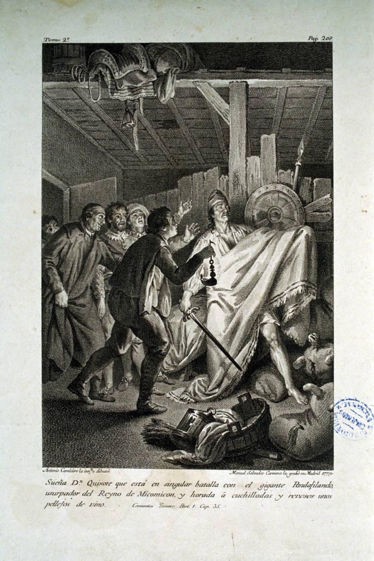 Salvador Carmona, Manuel. Sueña Dn Quixote que está en singular batalla con el gigante Pandafilando, usurpador del Reyno de Micomicon, y horada á cuchilladas y reveses unos pellejos de vino [Material gràfic] / Antonio Carnicero la inv.tò y dibuxò ; Manuel Salvador Carmona la grabò en Madrid 1779. [Madrid : Joaquín Ibarra, 1780].