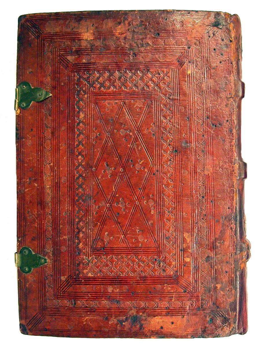 Enquadernació de pell de vedell sobre fusta d’estil gòtico-mudèjar. Tanques metàl·liques. Finals del segle XV.