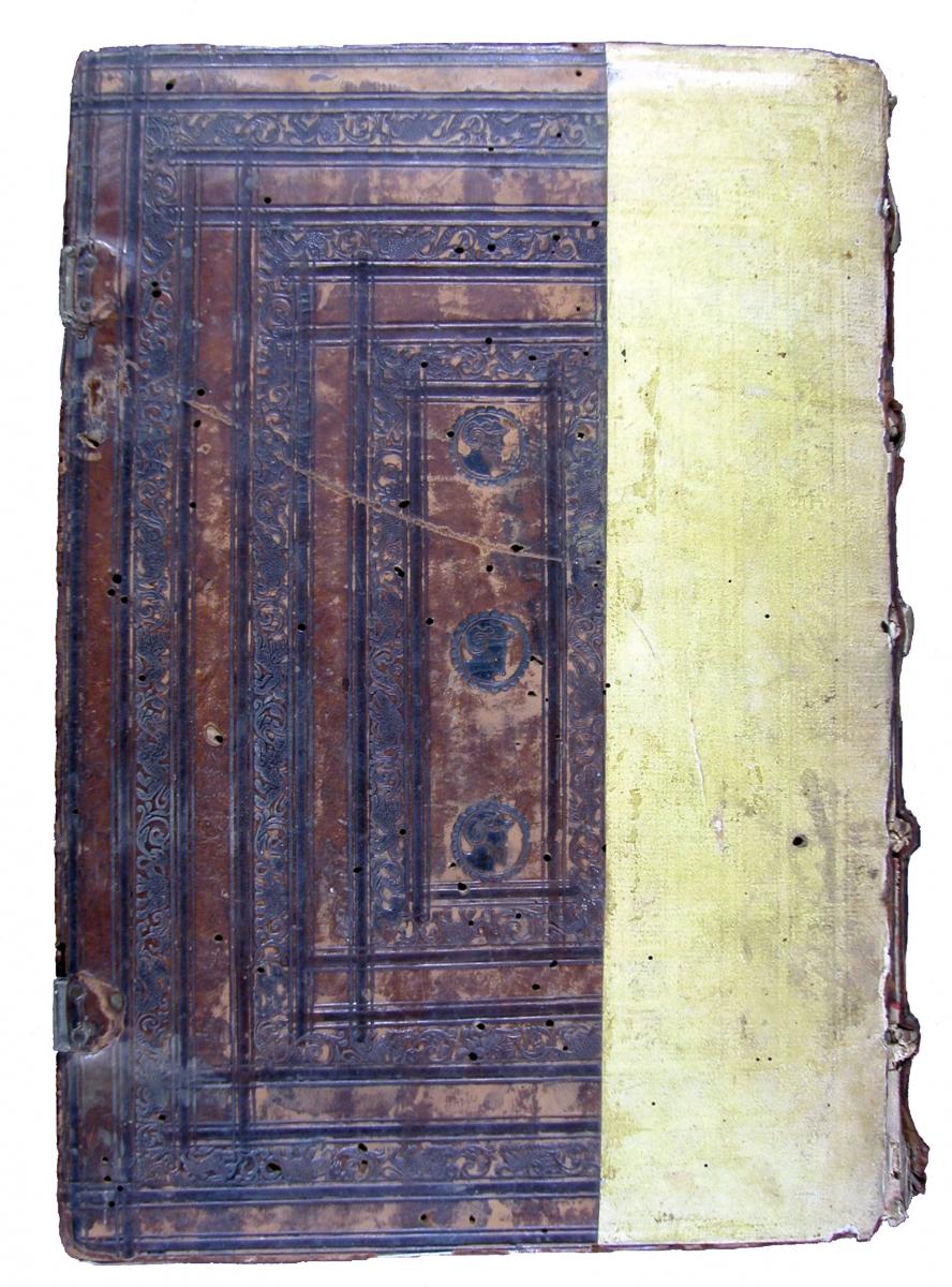 Enquadernació de pell de vedell sobre fusta d’estil plateresc, no original. Restes de tanques metàl·liques. Paper pintat de groc amb sofre, desinfectant per als insectes i contra el contagi de la pesta, enganxat al llom i part de les cobertes. Segle XVI.