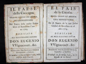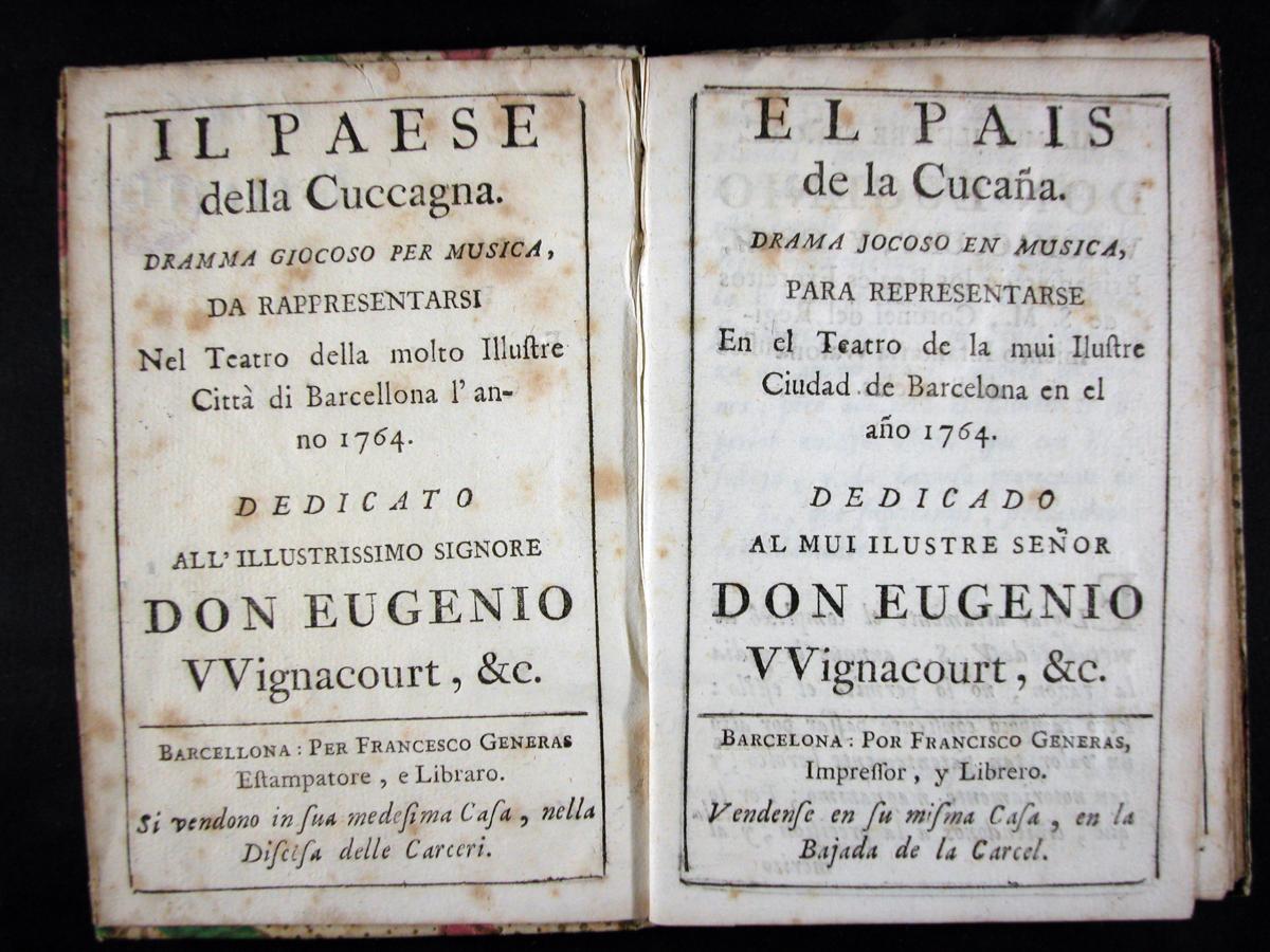 | Goldoni, Carlo, 1707-1793. El Pais de la cucaña : drama jocoso en musica para representarse en el teatro de la ... ciudad de Barcelona en el año 1764 = Il Paese della cuccagna / [musica di Giacomo Rust]. Barcelona : por Francisco Generas ..., [1764?]. 07 XVIII-3206 |