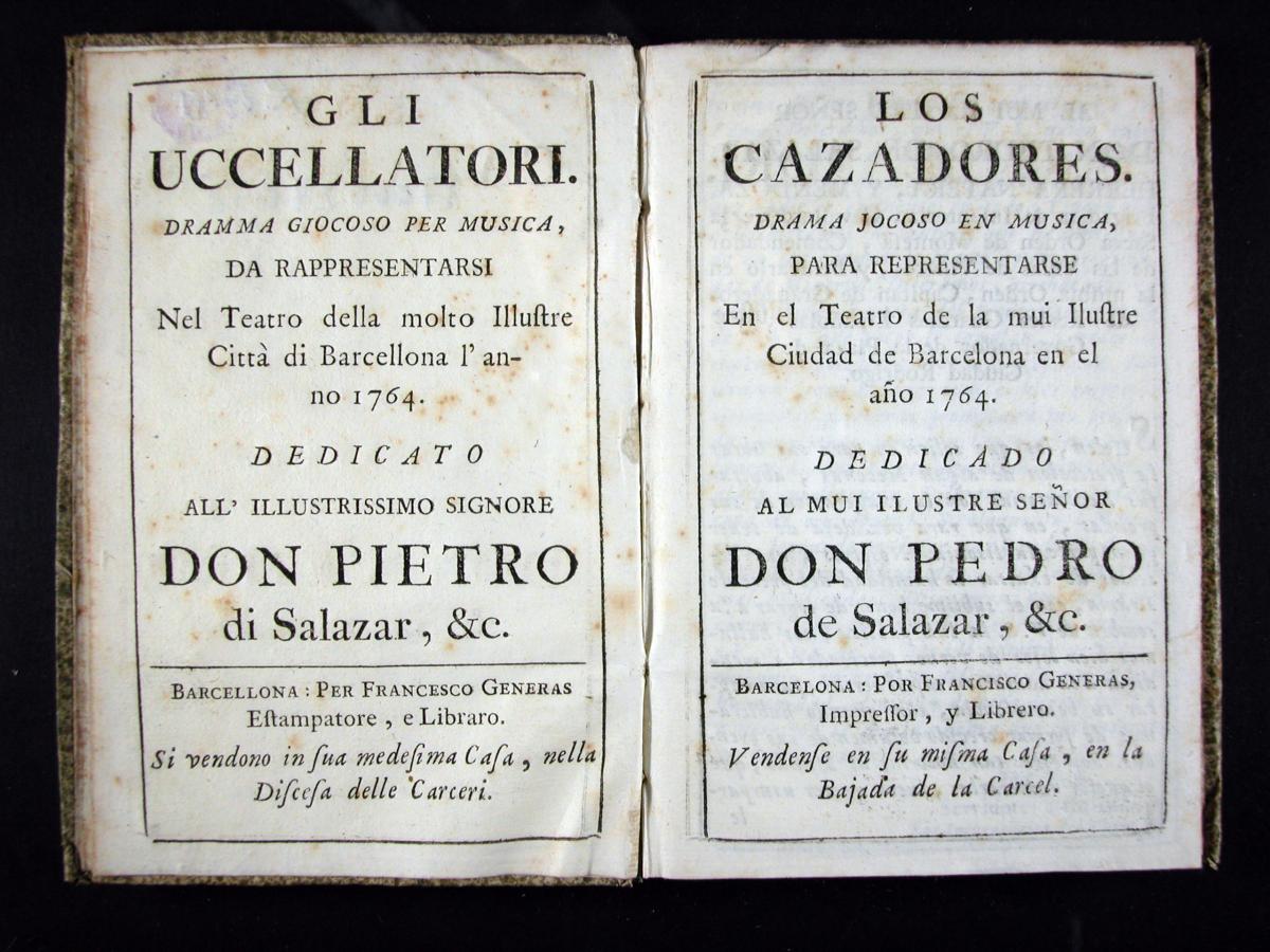 | Goldoni, Carlo, 1707-1793. Los Cazadores : drama jocoso en musica para representarse en el teatro de la ... ciudad de Barcelona en el año 1764 = Gli Uccellatori : dramma giocoso per musica / [musica de Floriano Gazman]. Barcelona : por Francisco Generas ..., [1764?] 07 XVIII-3199 |