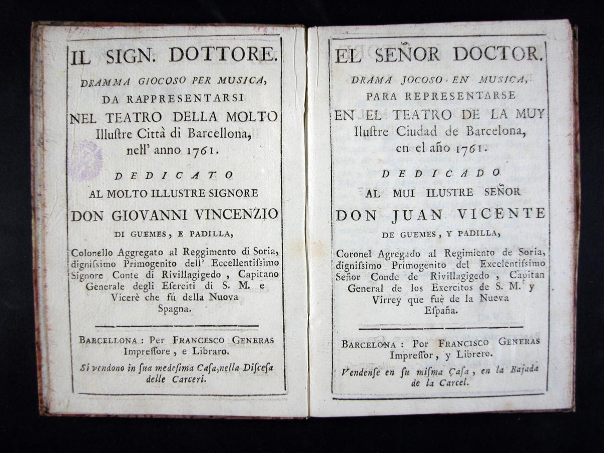 | Goldoni, Carlo, 1707-1793. El Señor Doctor : drama jocoso en musica para representarse en el teatro de la ... ciudad de Barcelona en el año 1761 = Il Sign. Dottore : dramma giocoso per musica / [musica de Domingo Fischietti]. Barcelona : por Francisco Generas ..., [1761?] 07 XVIII-3211 |