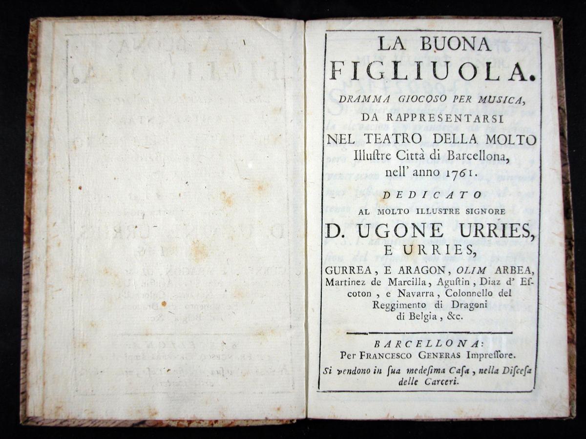 | Goldoni, Carlo, 1707-1793. La Buona figliuola : dramma giocoso per musica da rappresentarsi nel teatro della ... città di Barcellona, nell'anno 1761 ... / [musica di Niccoló Piccini]. Barcellona : per Francesco Generas ..., [1761?]. 07 XVIII-3212 |