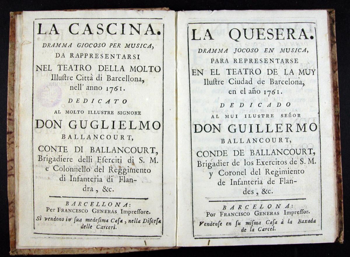 | Goldoni, Carlo, 1707-1793. La Quesera : dramma jocoso en musica para representarse en el teatro de la ... ciudad de Barcelona, en el año 1761 ... = La Cascina / [musica de Giuseppe Scolari, Arias de Francesco Brusa]. Barcelona : por Francisco Generas ..., [1761?]. 07 XVIII-3325 |