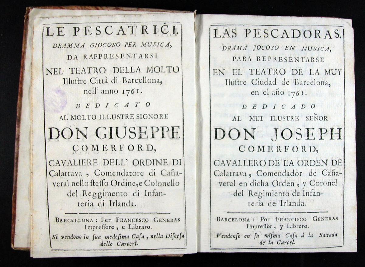 | Goldoni, Carlo, 1707-1793. Las Pescadoras : drama jocoso en musica para representarse en el teatro de la ... ciudad de Barcelona en el año 1761 ... = Le Pescatrici : dramma giocoso per musica ... / [musica di Ferdinando Bartoni]. Barcelona : por Francisco Generas ..., [1761?] 07 XVIII-3330 |