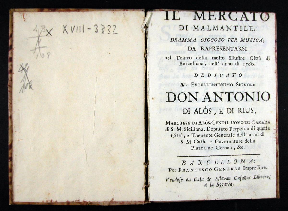 | Goldoni, Carlo, 1707-1793. Il Mercato di Malmantile : dramma giocoso per musica da rapresentarsi nel teatro della ... città di Barcellona, nell'anno di 1760 ... / [musica di Domenico Fischetti]. Barcellona : per Francesco Generas ... : vendese en casa de Estevan Casañas ..., [1760?]. 07 XVIII-3332 |