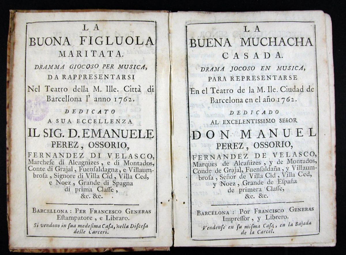 | Goldoni, Carlo, 1707-1793. La Buena muchacha casada : drama jocoso en musica para representarse en el teatro de la ciudad ... de Barcelona en el año 1762 ... = La Buona figluola maritata / [musica de Niccoló Piccini]. Barcelona : por Francisco Generas ..., [1762?]. 07 XVIII-3340 |