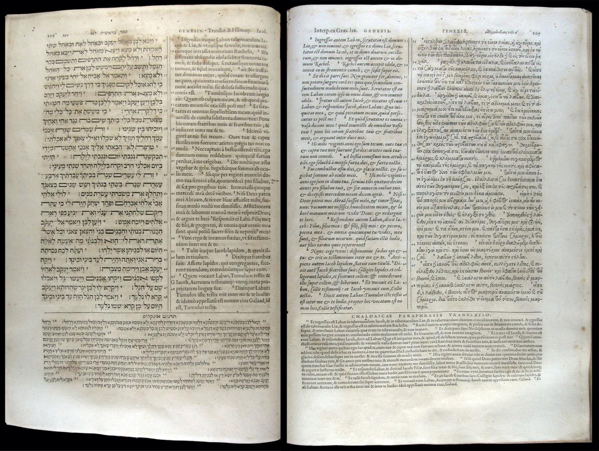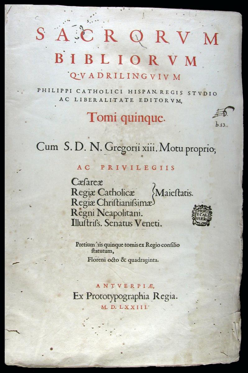 Bíblia poliglota en 8 volums i 5 llengües: llatí, grec, hebreu i arameu. El mateix Plantin es posà en contacte amb Gabriel de Çayas, el secretari de Felip II, per proposar al rei espanyol un projecte ambiciós: una nova edició de la bíblia poliglota que continuaria l’èxit de la d’Alcalà (1514-1517). La Bíblia poliglota va ser editada sota la supervisió de Benito Arias Montano, gran teòleg i humanista que Felip II envià des d’Espanya, esdevenint ben aviat un bon amic de Christophe Plantin amb qui va mantenir estret contacte al llarg de la seva vida.