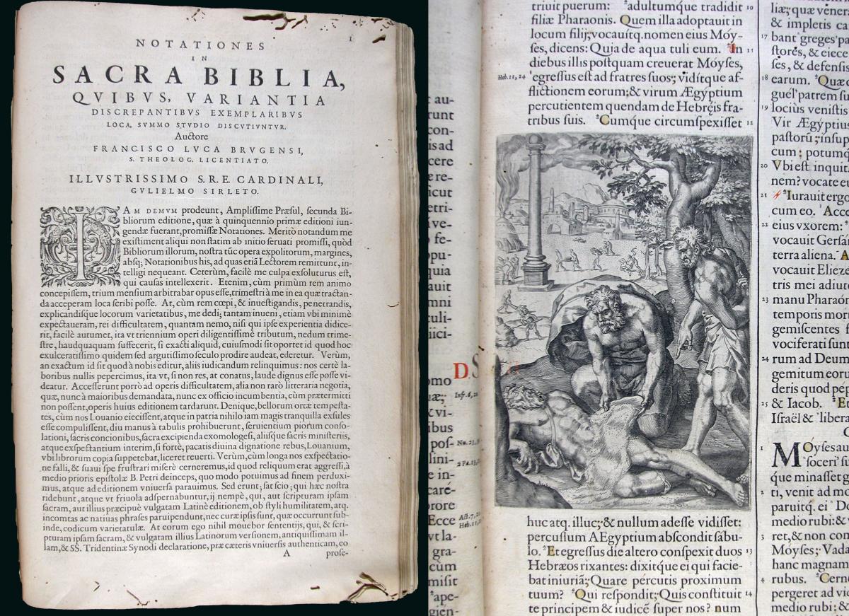 Bíblia que destaca per l’exquisida qualitat tipogràfica i la bellesa de les seves il·lustracions: 89 gravats calcogràfics distribuïts al llarg del text. Magnífica portada calcogràfica signada per Abraham de Bruyn a partir d’un dibuix de Crispijn van den Broeck. També col·laboraren en aquesta edició els artistes Pieter van der Brocht, Jan de Sadeler i Joannes Wiericx. Novament, Christophe Plantin rebé el suport financer del rei d’Espanya, tot i que en aquell moment el país estava en guerra per obtenir la independència del regne espanyol.
