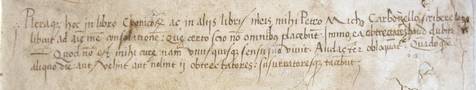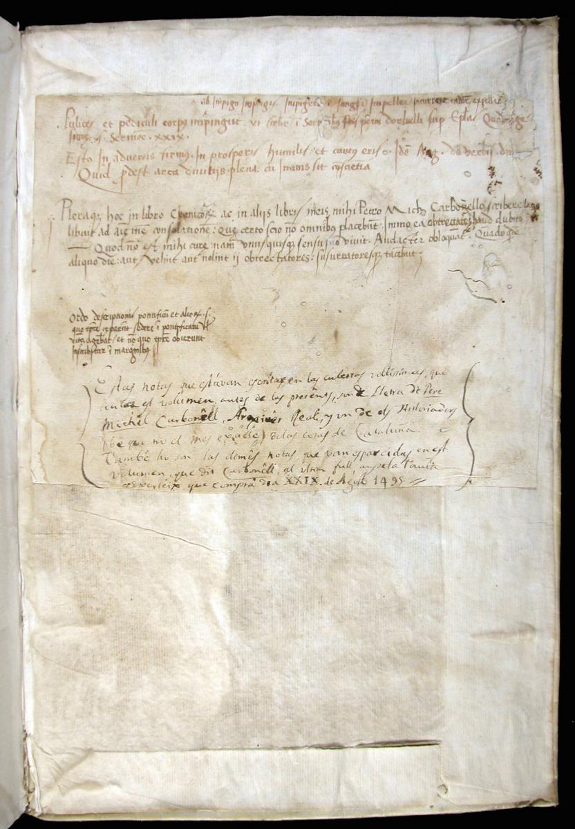 Nota de compra al voltant de la marca tipogràfica, al f. F8 verso (29.VIII.1495): “Petrus Michael Carbonellus, regius archivarius, comparavit pretio exoluto die XXIXº augusti Mº CCCCº LXXXXV, Ferrando II foeliciter regnante”.
