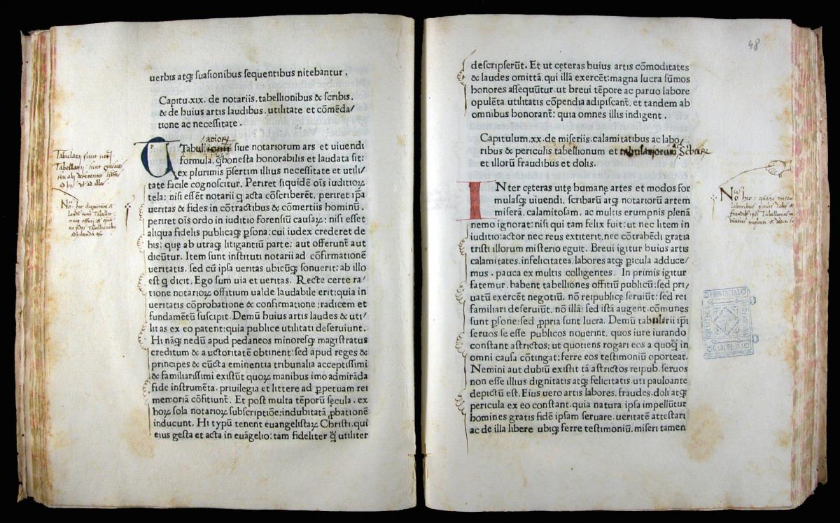 Exemplar incomplet: falta el f. [a]1, en blanc, enquadernació en pergamí sobre cartró (s. XVIII), en mal estat, 26 cm., talls pintats, guillotinat. Alguns forats d'insectes, taques d'humitat. Caplletra afiligranada al f. [a]2, caplletra embotida al f. [k]1, inicials simples en blau i vermell. Lletres realçades. Ex-libris manuscrit al f. [a]2: "Es de la Biblioteca mariana del Convento de San Francisco de Barcelona" (s. XVIII/XIX).